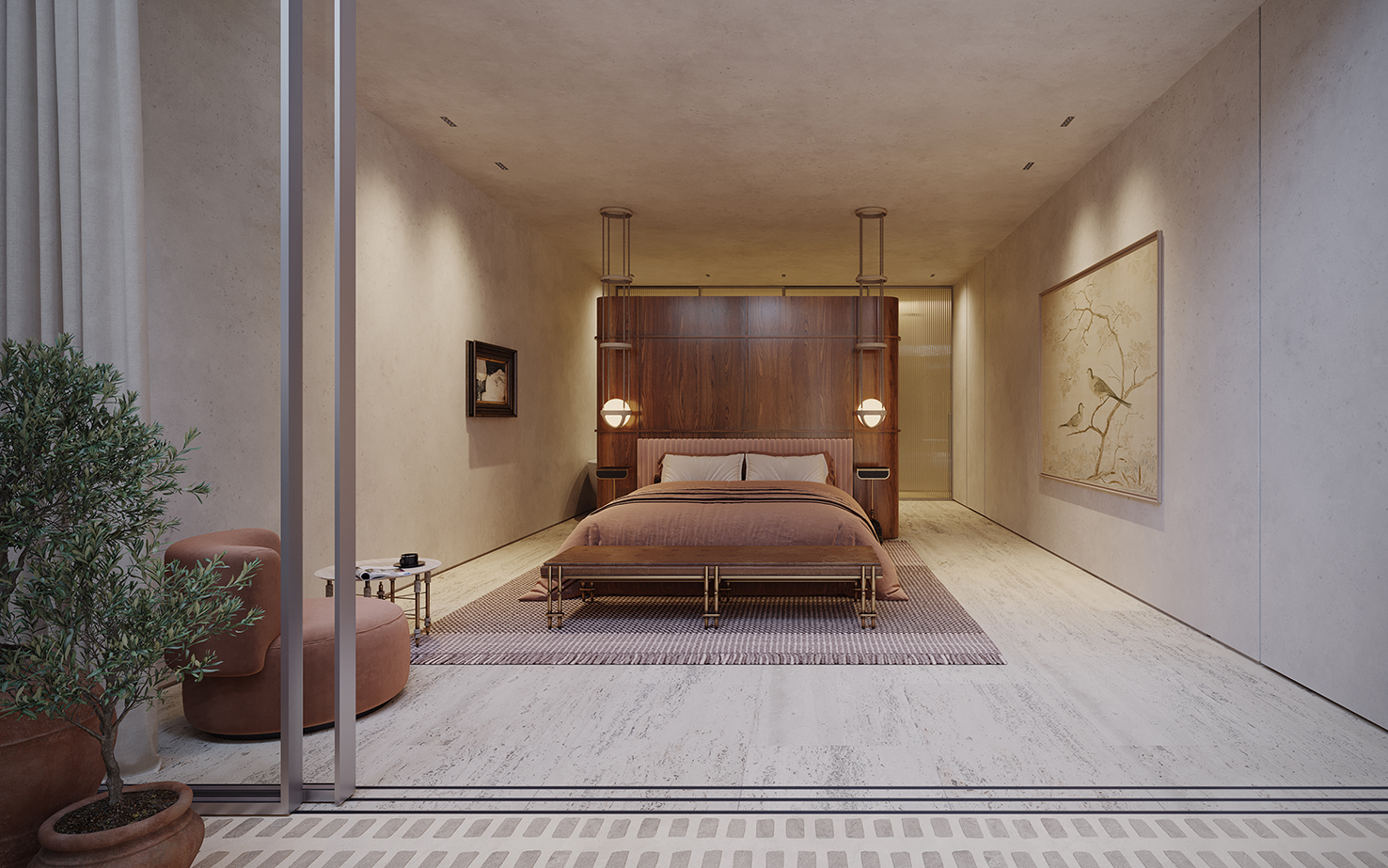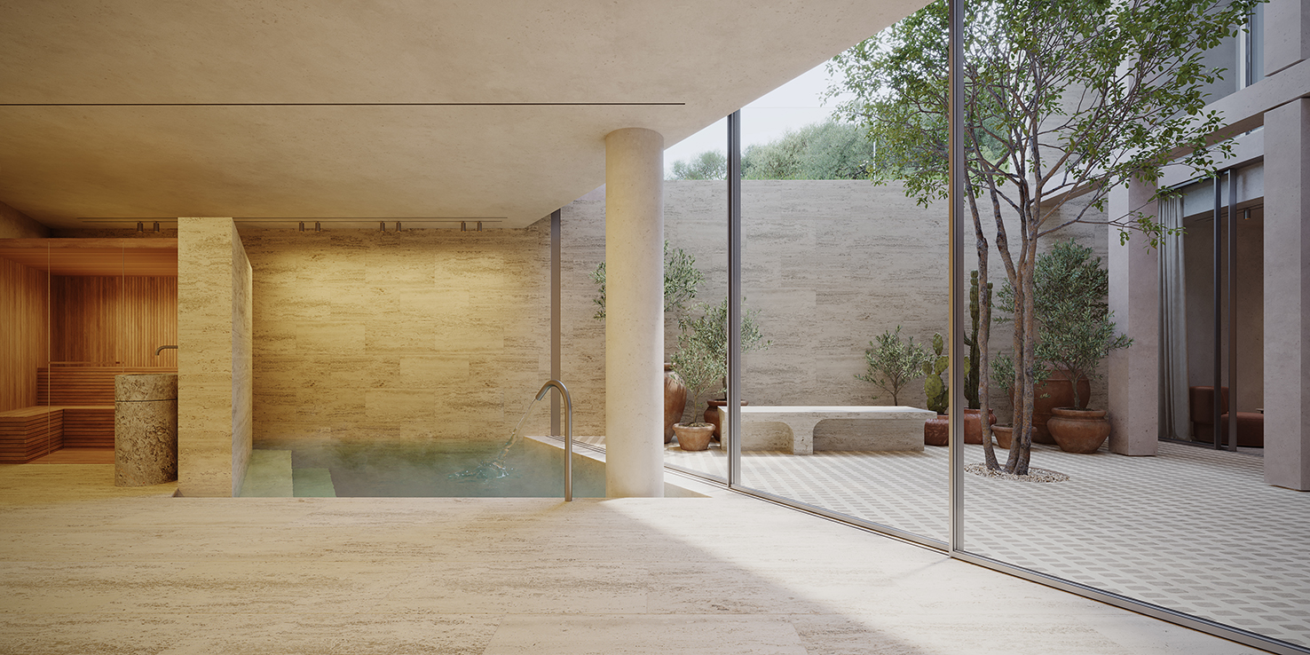 Instantly upon arrival the residents and their guests step into the entrance through a large stone wall, seemly monolithic and into a welcome courtyard that ultimately leads into the seven-meter height concourse with a vertical circulation of the plan also unveiling the first-floor suite tower.
